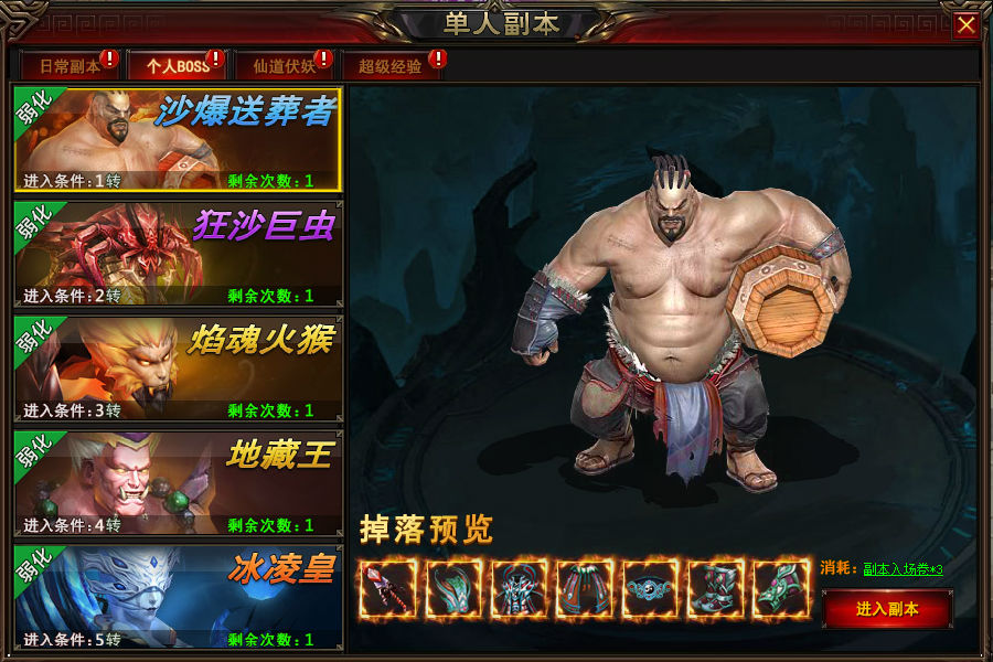 根据转生条件不同,消耗副本入场券可以进入不同的个人BOSS副本。