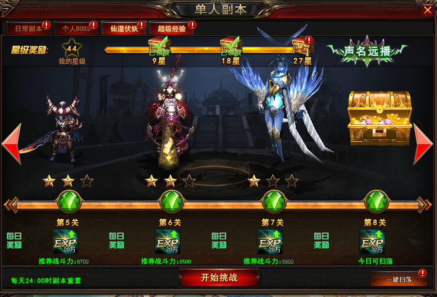 首次通关后可以获得坐骑升级丹、经验和称号奖励,3星通关的,每天可以直接扫荡